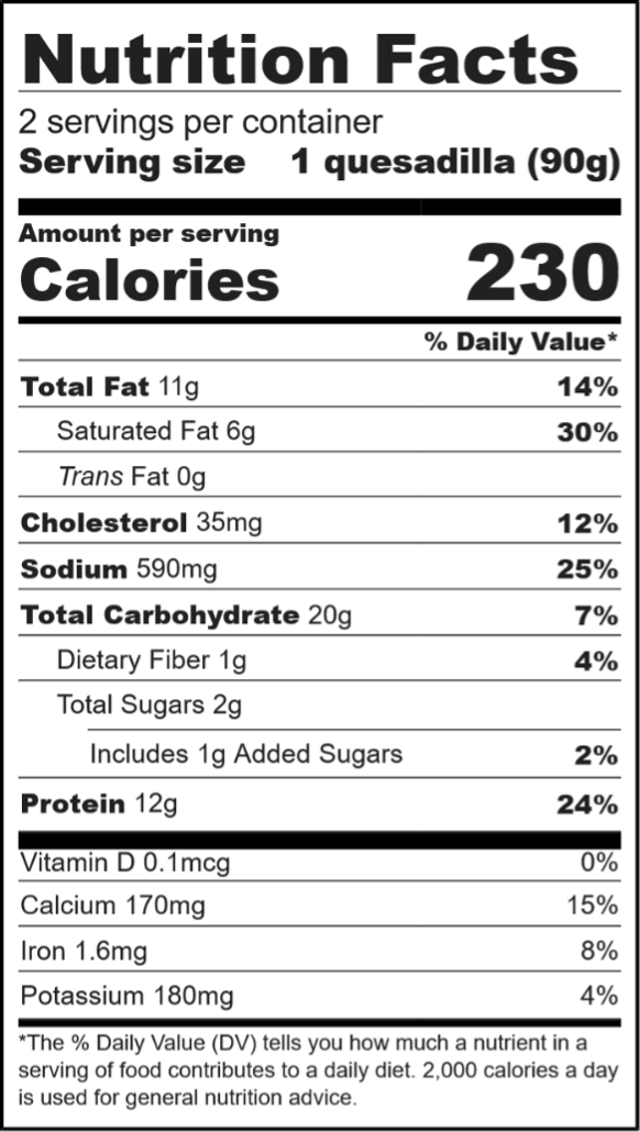 ​​Flour Tortilla (Enriched Flour (Wheat Flour, Niacin, Reduced Iron, Thiamine Mononitrate, Riboflavin, Folic Acid), Water, Vegetable Shortening (May Contain One Or More Of: Palm Oil, Soybean Oil, Corn Oil), Sugar, Salt, Sodium Bicarbonate, Sodium Aluminum Phosphate, Potassium Sorbate (Preservative), Fumaric Acid, Mono & Diglycerides, Calcium Propionate (Preservative), Enzyme, Dough Conditioner (Sodium Metabisulfite)), Cooked Chicken (Dark And White Meat Chicken, Water, 2% Or Less Of Vinegar, Rice Starch, Salt), Cheese Blend (Monterey Jack Cheese (Pasteurized Milk, Cheese Culture, Salt, Enzymes), Cheddar Cheese (Pasteurized Milk, Cheese Culture, Salt, Enzymes, Annatto (Color)), Asadero Cheese (Pasteurized Milk, Cheese Culture, Salt, Enzymes), Quesadilla Cheese (Pasteurized Milk, Cheese Culture, Salt, Enzymes), Potato Starch, Powdered Cellulose Added To Prevent Caking, Natamycin (Natural Mold Inhibitor)), Water, Salt, Sour Cream (Cream, Cultures, Lactic Acid), Maltodextrin, Modified Food Starch, Sugar, Highly Refined Coconut Oil, Garlic Powder, Whey, Spices, Cultured Nonfat Milk Solids, Onion Powder, Ground Paprika, Less Than 2% Of Nonfat Milk, White Distilled Vinegar, Lactic Acid, Citric Acid, Natural Flavors, Soy Lecithin, Sodium Caseinate, Mono And Diglycerides, Sodium Diacetate, Xanthan Gum, Titanium Dioxide (Color), Highly Refined Soybean Oil, High Oleic Sunflower Oil